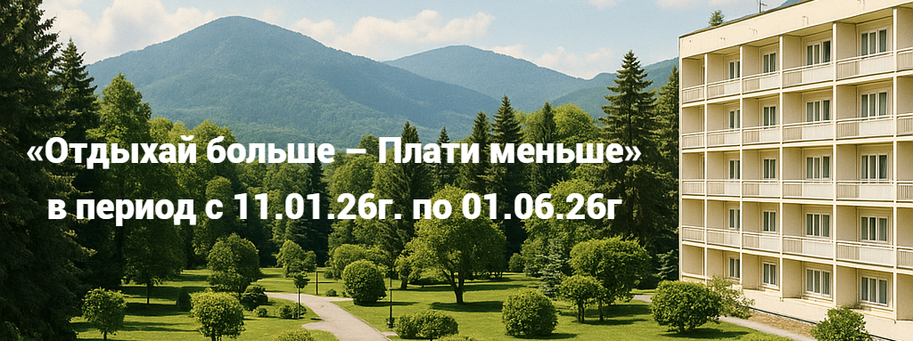 Цены на путевки действительны для размещения в период с 11.01.2026г. по 01.06.2026г. Акция распространяется на любые категории номеров и не суммируется с другими предложениями санатория. На ранее купленные путевки, по данной акции, скидка не распространяется. Предложение действует для физических и юридических лиц. Успейте купить! Количество номеров ограничено.